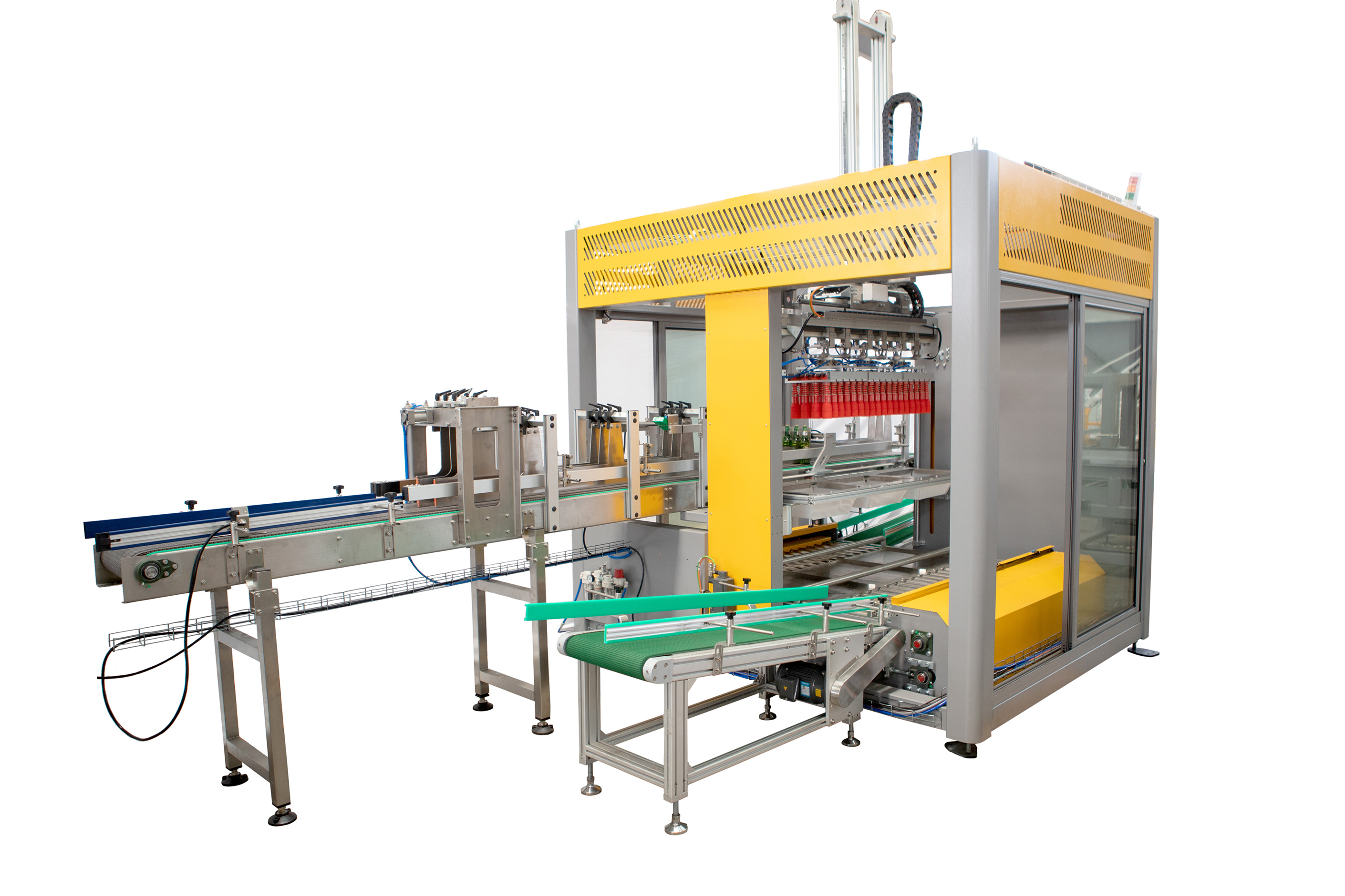 主傳動采用變頻調速及PLC控制技術,結合人機界面,實現無極調速,具有快速的通訊能力和強大的診斷功能,自動化程度高。采用側進瓶方式,占地面積小,簡化裝箱機前的輸送系統,降低整線設備投資成本。采用搖臂式結構,結構更先進合理,動作更輕便平穩,功耗也較小。采用多級減壓進瓶方式,避免倒瓶現象,使抓瓶頭與產品對位準確,穩定性高。符合國家安全標準,設有多種保護功能,出現故障時及時報警,可停機保護。